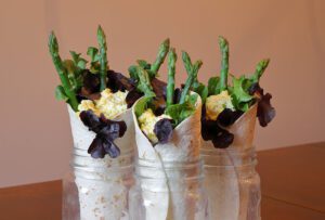 Place eggs in a large mixing bowl. Using a pastry blender, chop eggs until coarse pieces form. Add chopped scallion, mayonnaise, lemon zest, tarragon and parsley to chopped eggs; stir to combine. Season to taste with salt and pepper.- Lay out tortillas on a work surface. Place several lettuce leaves and 2 to 3 asparagus spears on the tortillas. Evenly divide egg salad among the tortillas; season to taste with salt and pepper. Roll up the tortillas, encasing egg salad, lettuce and asparagus inside. Serve immediately or keep refrigerated until ready to serve.