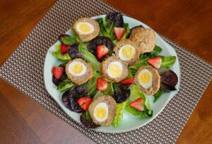 - Transfer coated sausage rounds to prepared baking sheet and bake for approximately 35 to 40 minutes. Remove Scotch eggs to a rack to cool slightly before serving. Place eggs on a platter lined with fresh lettuce leaves and sliced strawberries.