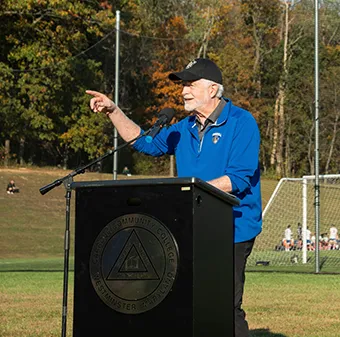 Emeritus President Dr. James Ball delivers remarks during the groundbreaking ceremony for Carroll Community College’s new athletics complex, which has been named in his honor—the Dr. James Ball Athletics Complex.