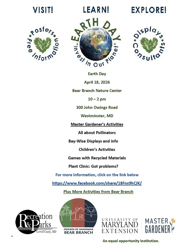 Join the Friends of Hashawha Bear Branch and the Carroll County Master Gardeners for an Earth Day celebration on Saturday, April 18 from 10am to 2pm at the Bear Branch Nature Center in Westminster. This is a FREE educational and fun-filled day full of activities available for all to enjoy. Learn about the many ways YOU can help protect and preserve the Earth for the future. Information about pollinators, Bay-Wise, and monarch butterflies will also be on display. Participate in the Scavenger Hunt that highlights some of the wildlife that lives at the Nature Center.