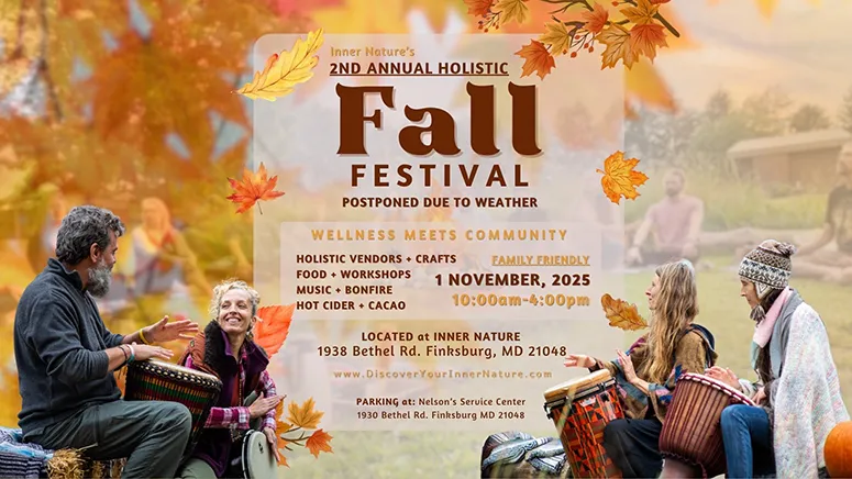 Rescheduled from OCT. 12th date due to Safety Concerns regarding the Coastal Storm – Potential Flash Floods & Heavy Winds. Free admission! A Day of Wellness, Community, and Connection in the Heart of Fall. Join us in Finksburg for a day of gathering, live music, and community spirit. This family-friendly festival is all about connection — stroll the land at Inner Nature, discover local vendors, and gather in community.