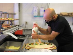 Taormina noted that the Sicilian-style pizzas take some love and time to prepare. “The crust has to be precooked because it takes at least seven or eight hours to rise. Once the crust is cooked, you finish it off with ingredients and put it back in the oven. The result is at least a 2-inch-thick crust, which is softer and lighter than a regular pizza crust. People can’t believe how soft and light it is.”