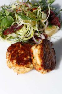 To accompany his specialty crab cakes, Chef Erkek selects seasonal vegetables for his sides. These may appear in the form of a root vegetable slaw served with a mustard sauce, for example.
