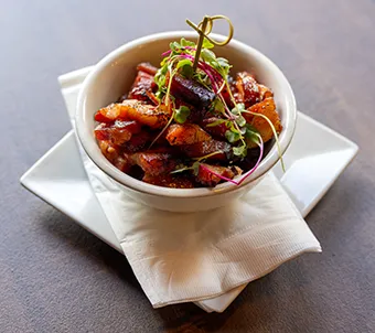 If you’re looking for something to nibble on as you sip your drink, you’ll find a bevy of bar bites that fit the bill. The Maple Bourbon Pork Belly Bites dress up Hahn’s famous pork belly, smoked, roasted, and brushed with a bold but sweet maple bourbon glaze.
