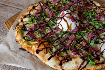 The Luca wood-fired pizza packs a plethora of textures and colors onto your slice of the pie — house-made garlic oil, shredded mozzarella, thinly sliced prosciutto, peppery arugula, fresh burrata, a drizzle of truffle oil, and a syrupy balsamic glaze.